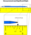 A scale with demarcations of the same interval. You can read a measurement based on where it falls on the scale. Read ONE DIGIT past the smallest increment on the scale.