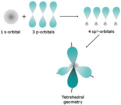 A type of hybridization that results from the combination of the s orbital and all three p orbitals in the second energy level of carbon, resulting in four hybrid orbitals and occurs when a carbon atom is bonded to four other atoms. The geometric arrangement of those four hybrid orbitals is called tetrahedral.
